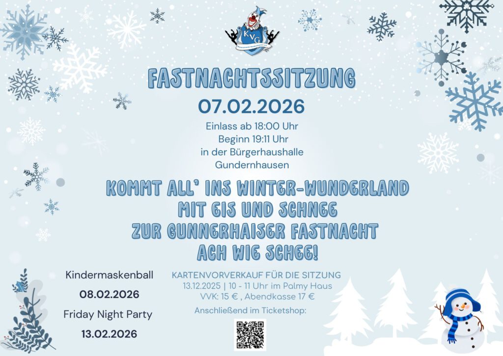 Am 13.12.2025 findet unser Vorverkauf für unsere Fastnachtssitzung unter dem Motto „Kommt all‘ ins Winter-Wunderland – mit Eis und Schnee – Zur Gunnerhaiser Fastnacht – Ach wie schee!“ in der Hofreite Palmy statt.